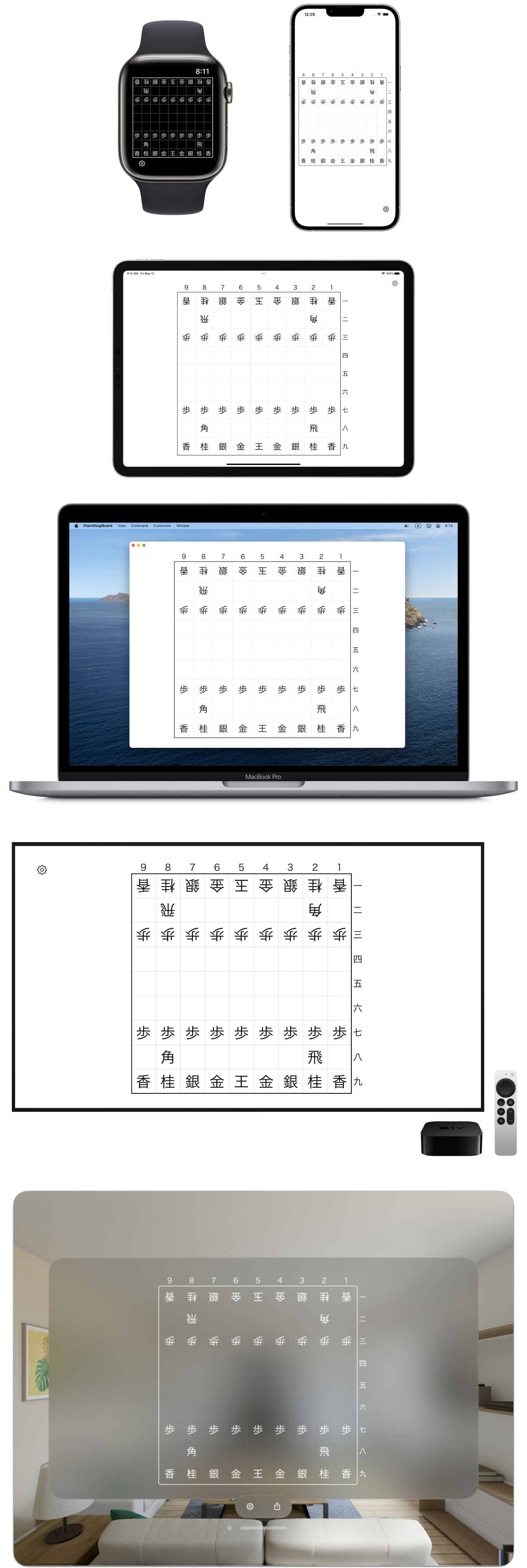 Apenas um tabuleiro de Shogi com peças que se movem livremente - aplicação para iPhone, iPad, Mac, Apple Watch, Apple TV e Apple Vision Pro.
